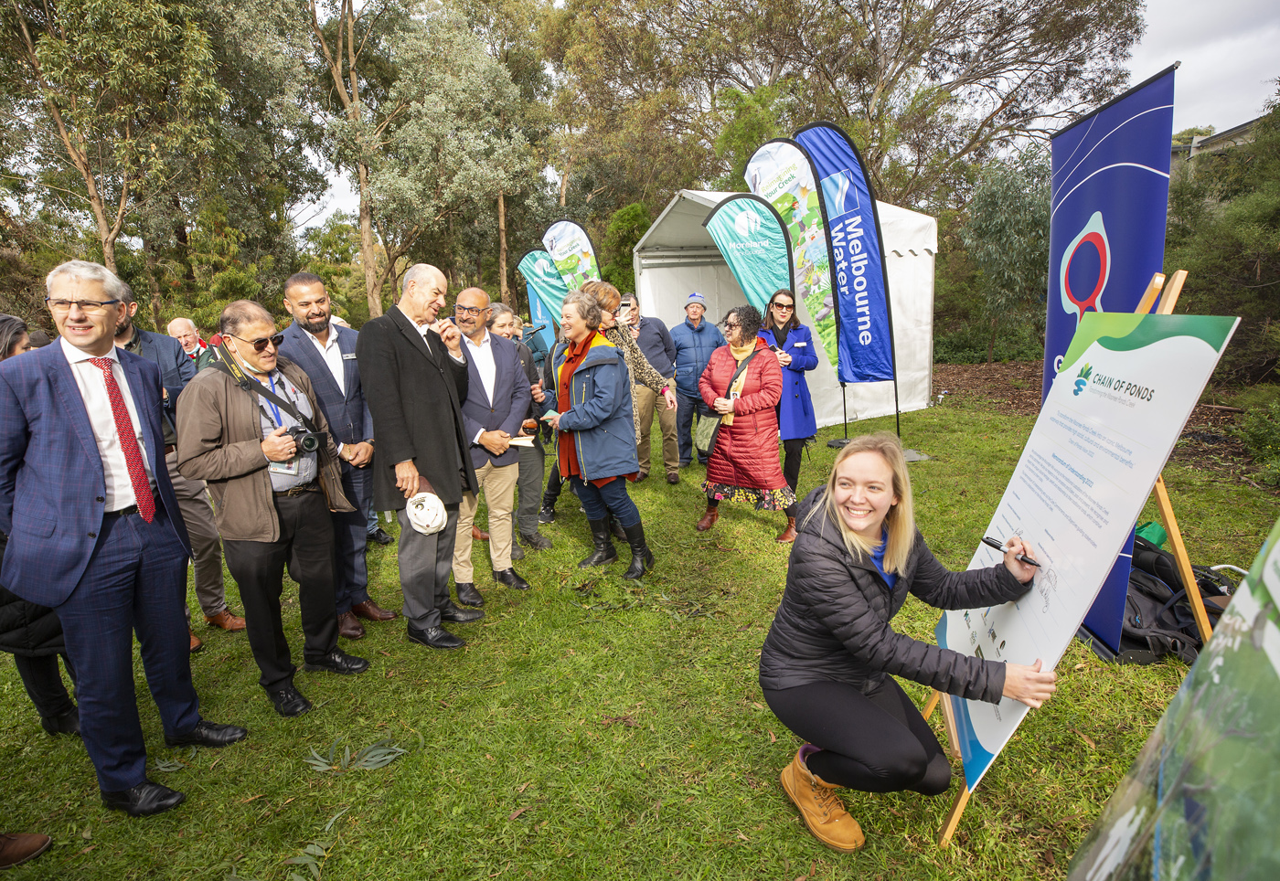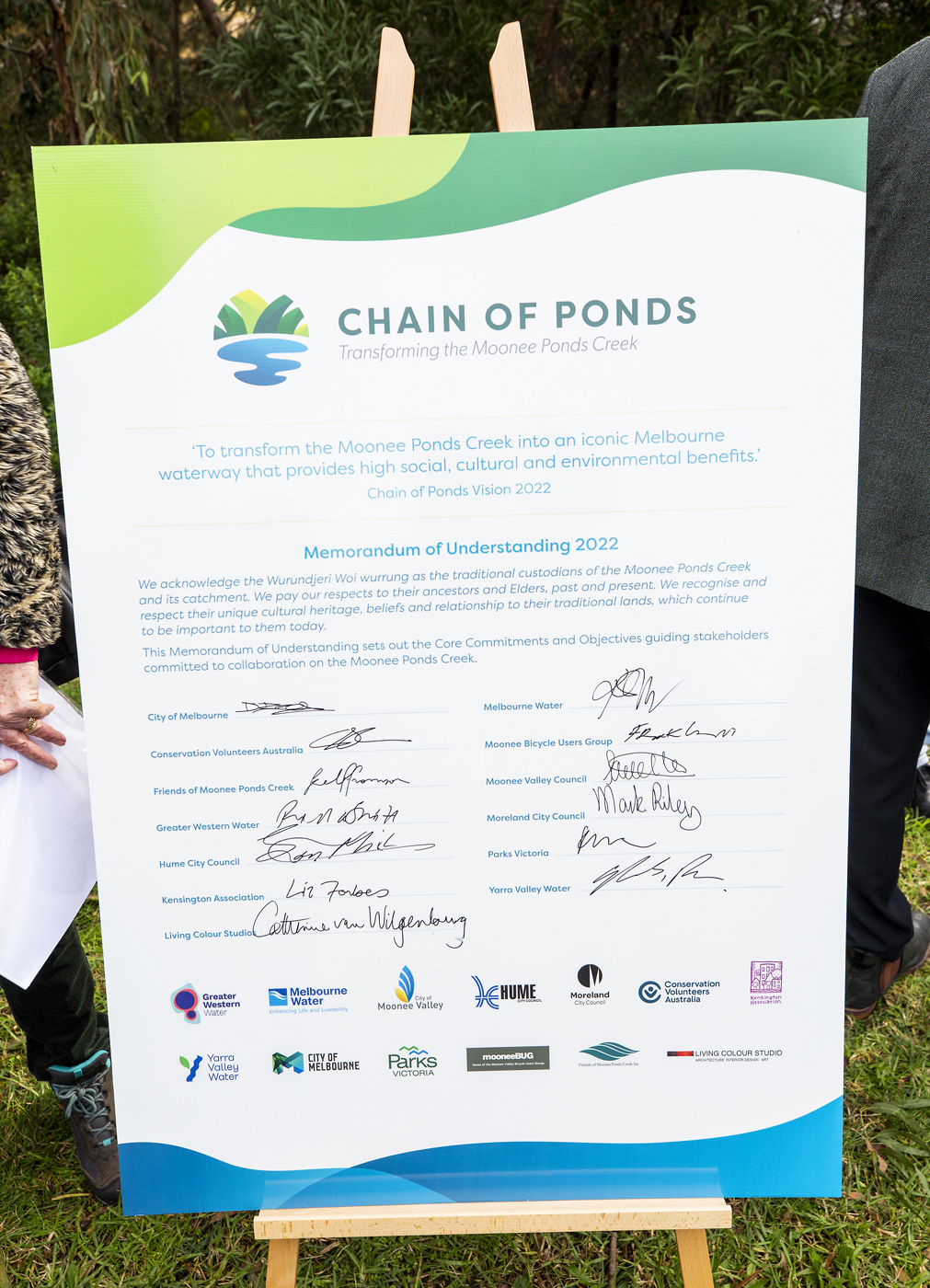 The exciting project is a centrepiece of the Chain of Ponds Collaboration Group, made up of 15 community and government organisations committed to transforming Moonee Ponds Creek into an iconic Melbourne Waterway. Following the sod-turning, Council joined 12 partner organisations to sign the new Memorandum of Understanding (MoU). The new MoU ensures the group continues to work together to identify, create and deliver projects that enhance the environmental, cultural and social values of Moonee Ponds Creek.